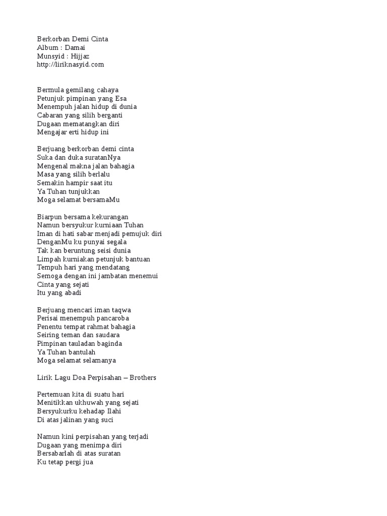 Pertemuan kita di suatu hari menitiskan ukhwah yang sejati bersyukurku ke hadrat ilahi di atas jalinan yang suci. Lirik lagu doa perpisahan brotherspertemuan kita di suatu hari menitikkan ukhuwah yang sejati bersyukurku kehadap ilahi di atas jalinan yang suci namun kini perpisahan yang terjadi dugaan yang menimpa diri bersabarlah di atas suratan ku tetap pergi jua kan kuutuskan salam ingatanku dalam. Pertemuan kita di suatu hari menitikan ukhuwah yang sejati bersyukurku kehadirat illahi di atas jalinan yang suci. Download lagu doa perpisahan dapat kamu download secara gratis di downloadlagu321.site. Download lagu doa perpisahan dan streaming kumpulan lagu doa perpisahan mp3 terbaru gratis dan mudah dinikmati, video klip doa perpisahan mp4, lirik lagu doa perpisahan full album. Di blog ini, kami hanya memaparkan lirik lagu. Ada 20 gudang lagu brothers doa perpisahan lirik terbaru, klik salah satu untuk download lagu mudah dan cepat. 0 ratings0% found this document useful (0 votes). Namun kini perpisahan yang terjadi dugaan yang menimpa diri bersabarlah di atas suratan ku tetap pergi jua kan ku utuskan salam ingatanku dalam doa kudusku sepanjang waktu ya allah. Kan ku utuskan salam ingatanku dalam doa kudusku sepanjang waktu ya allah bantulah hamba mu. Namun kini perpisahan yang terjadi dugaan yang menimpa diri bersabarlah diatas suratan kutetap pergi jua. Sigma istikharah cinta lirik lagu. Berikut lirik lagu doa perpisahan ~ brothers ~: