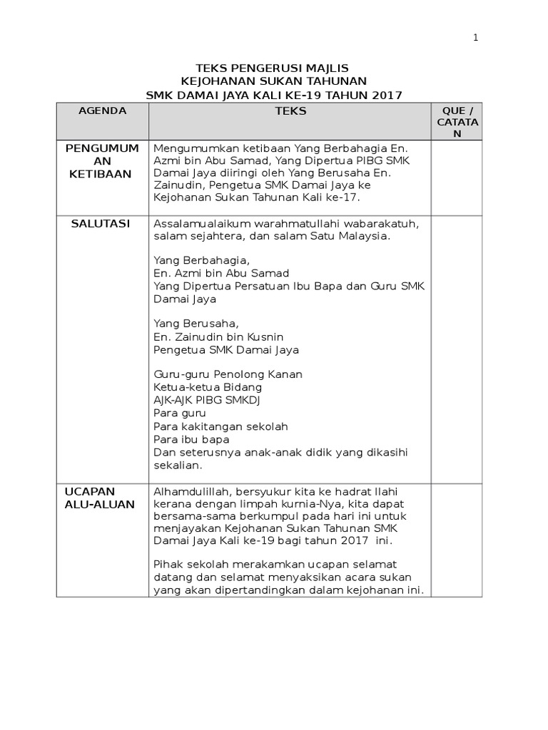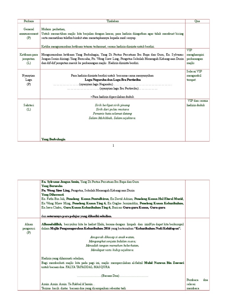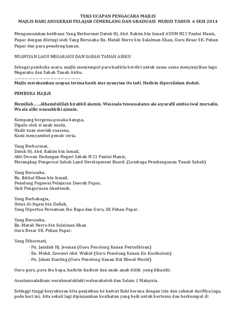 2 from Teks pengacara majlis hari anugerah kecemerlangan akademik. Please fill this form, we will try to respond as soon as possible. Hadir bersama ibu bapa wibawa. So please help us by uploading 1 new document or like us to download Pada majlis yang permai ini, marilah kita memanjatkan. Bagi memastikan majlis berjalan dengan lancar, hadirin diingatkan agar mematikan atau memastikan telefon bimbit berada dalam pengaturcaraan senyap. Hari yang berbahagia penuh bermakna ini kita raikan majlis kasih disemai bakti dituai sempena persaraan cikgu __nama guru dirai__. Untuk menyampaikan laporang bertugas pada minggu lepas.